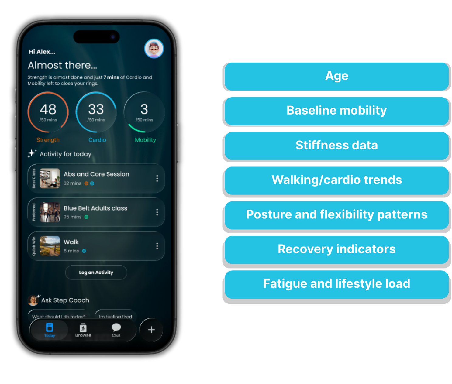 Generic programs ignore your age, stiffness, and schedule. Step’s adaptive model updates your weekly targets as your body and routine change.